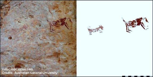 Sosok binatang anjing yang diolah sketsa ulang, muncul di beberapa lukisan batu, yang berarti mereka dicat beberapa saat setelah anjing diperkenalkan ke wilayah itu sekitar 3500 tahun yang lalu di pulau Kisar. [Credit: ANU]