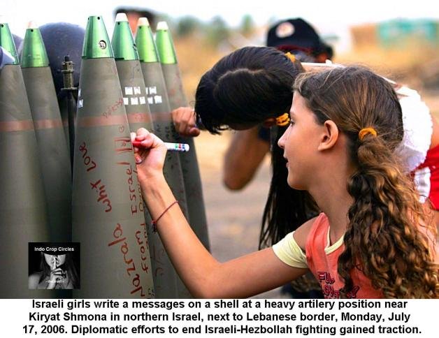 Anak-anak gadis Israel menulis sebuah pesan “dengan cinta” (with love) pada badan peluru di pos artileri berat dekat Kiryat Shmona di utara Israel, dekat perbatasan Lebanon, Senin, 17 Juli 2006 lalu. Usaha diplomatik sedang diupayakan untuk mengakhiri pertempuran Israel-Hizbullah mendapat daya tarik.