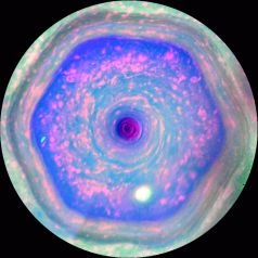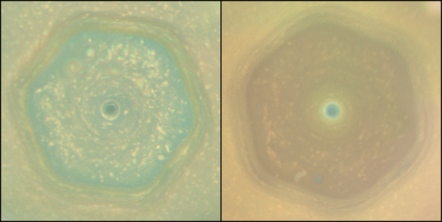 Pola hexagon di kutub utara Saturnus yang berubah warna. Warna pada tahun 2013 (kiri) dan tahun 2017 (kanan)