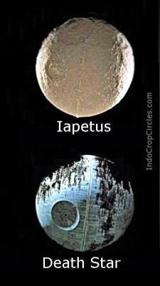 Bulan Saturunus bernama Iapetus (atas) dibandingkan dengan Death Star (bawah) sebagai satelit buatan atau alien satellite dalam film sci-fiction.