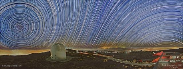 Keindahan alam semesta yang memperlihatkan dua “Kutub Langit”, bukti Bumi adalah bundar. Tampak foto “Jejak Bintang” atau Star Trails yang difoto dekat Teide Observatory, Tenerife, yang memperlihatkan dua belahan langit, yaitu “Belahan Langit Utara” atau northern hemisphere berikut terlihat pula “Kutub Langit Utara” berupa titik di langit (kiri), dan tampak pula “Belahan Langit Selatan” atau southern hemisphere yang mana “Kutub Langit Selatan” tak tampak karena berada di bawah cakrawala (kanan). Dengan foto yang memperlihatkan dua belahan langit atau dua kutub langit ini saja dapat dipastikan bahwa bentuk Bumi adalah bulat. (pict by Juan Carlos Casado)