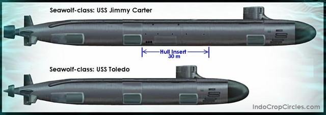USS Jimmy Carter (atas) adalah satu-satunya kapal selam dari kelas Seawolf-class yang dimodifikasi memiliki lambung sepanjang 30 meter, sehingga memungkinkan adanya ruang ekstra yang berguna sebagai kapal uji operasional untuk teknologi canggih terdepan.