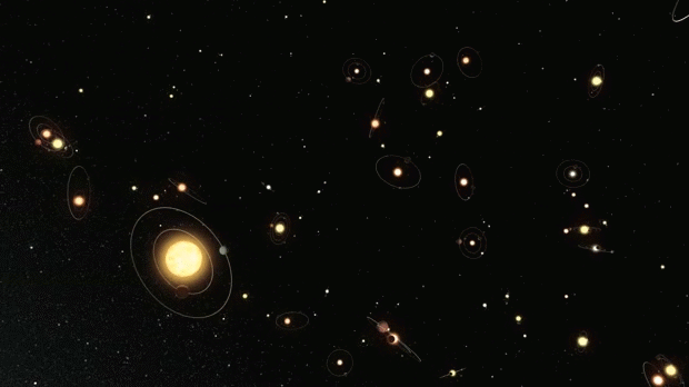 Gambar animasi alam semesta yang terdiri dari milyaran bintang, yang sebagian diantaranya terdapat planet-plenet yang mengorbitinya.